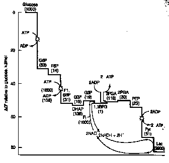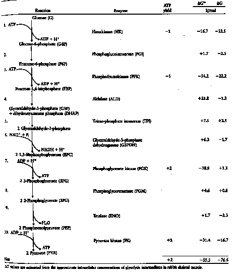 DG and are essentially irreversible. These are steps 1 (phosphorylation of glucose), 3 (phosphorylation of fructose-6-phosphate) and 10 (transfer of phosphate from phosphoenolpyruvate to ADP).