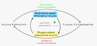 Phosphorylation of the bifunctional enzyme is regulated by blood glucose level, mediated by glucagon and insulin. High glucagon (low blood sugar) causes phosphorylation of the enzyme, which results in conversion of F-2,6-BP back to F6P, removing its stimulatory effect on PFK, and therefore slowing the rate of glycolysis.