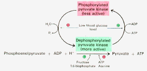Phosphorylation of pyruvate kinase is regulated by blood glucose level, just like PFK. High glucagon (low blood sugar) causes phosphorylation, which in this case renders the enzyme inactive.