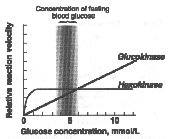 b cells have a distinct glucose transporter with a high Km, around 15-20 mM. In these cells, then, the amount of incoming glucose is pretty much proportional to the amount of glucose in the blood. This allows the b cells to monitor blood glucose levels directly, and thereby regulate insulin secretion. It also insures that glucose is taken up rapidly by the liver only when it is abundant; in the fasting state, more glucose is delivered to other tissues (particularly the brain).Muscle and fat cells express a third type of glucose transporter, with a Km around 5 mM. The level of expression of this transporter on the cell surface is rapidly regulated by insulin. Secretion of insulin causes translocation of these receptors from intracellular stores to the cell surface, allowing more efficient energy storage by these tissues when blood glucose is in excess.