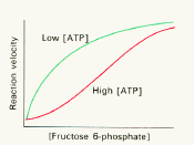 PFK is allosterically inhibited by ATP, so glycolysis is slowed when cellular ATP concentrations are high. ATP binds to a site on PFK distinct from the active site, causing a conformational change resulting in rotation of the positions of Arg162 and Glu161. In the high-affinity state, the positive charge on Arg162 stabilizes the negative charge on the phosphate of F6P, and Km is low. In the low-affinity state, the negative charge on Glu161 repels F6P.