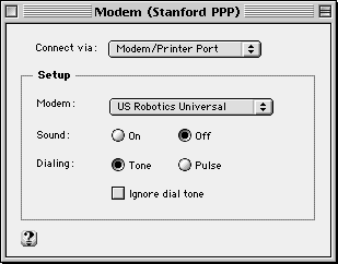 From the "Modem" list, select your modem. If you cannot find your modem on the list, you can click on the question mark in the lower left corner of the Modem control panel for specific instructions. In most cases you will be directed to consult your user's manual and/or software that came with the modem. Many modems come with software that will update your list of modems in the control panel. Go to the modem manufacturer's Web site to download the appropriate software. A brief list of the most common modem manufacturer's sites includes Global Village modems, Zoom modems (look for the appropriate "CCL" files), US Robotics/3Com (Search for your modem type). You will be looking for modem software: "CCL" files, "script" files, etc. Check the "Sound" on/off according to your preference. For troubleshooting purposes, you may want to leave the "Sound" option "On" to get an audible indicator of your computer connecting to the modem. For most places in the Stanford area, select "Tone" Dialing. |