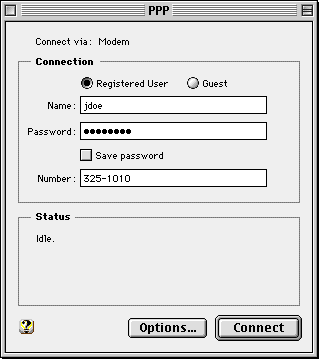 Turn on your modem and make sure it is connected properly to your Macintosh. From the Control Panels option in the Apple menu select the PPP control panel. Click on the Connect button. You should hear modem tones (unless you selected silent operation) as your modem places the call. The status block will show PPP starting, authentication taking place and ending with the status of your PPP connection. At this point, the "Connect" button should turn into a "Disconnect" button. Should you choose to do so, closing the "PPP" control panel window will not disconnect your session. You can now use any of the software that depends on TCP/IP for its connectivity, i.e. Netscape Navigator, Eudora, Newswatcher, Fetch, etc. When you are finished with your session, close the network applications, return to the "PPP" control panel and click on the "Disconnect" button to gracefully terminate your session. |