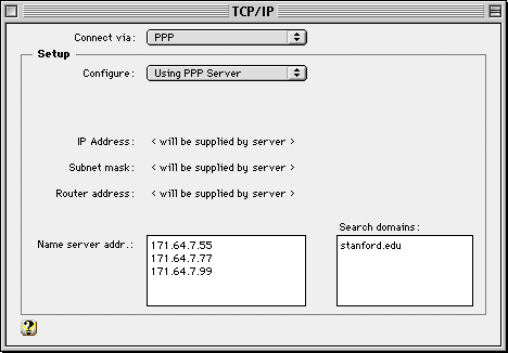 The "Configure" option will automatically set itself to "Using PPP Server". Note that the "IP Address", "Subnet Mask" and "Router Address" fields now say "< will be supplied by server >". The PPP server will download this information to your Macintosh when you establish a connection. Confirm that the "Name server address" box has the IP addresses of Stanford's name servers. If not, enter the following addresses, each on a separate line: 171.64.7.55, 171.64.7.77 and 171.64.7.99. Confirm that the "Search domain" box has Stanford's domain listed. If not, enter "stanford.edu", without the quotes. Close the Control Panel and click on "Save" when asked. |