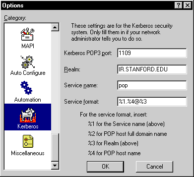 | Verify that you Eudora Kerberos Settings look exactly the same as in the screenshot above. Note "IR.STANFORD.EDU" should be in all-caps.
