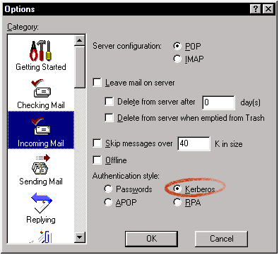 | Securing Password Transfers for Reading Email in Eudora These pages describe how to configure Eudora for Kerberized connections. You should already have installed and configured MacLeland and MacSamson, and created a .klogin file in your CMGM account for Kerberized connections. PCSamson is Stanford's own Kerberized telnet client (for logging in to CMGM, using PINE, ELM, or other telnet applications). PCLeland is a Stanford-specific program to Kerberize password connections. Instructions for configuring and installing Eudora are available here. |