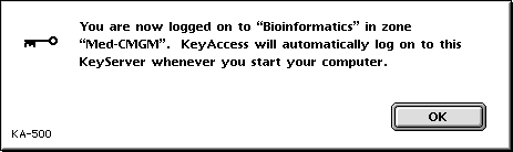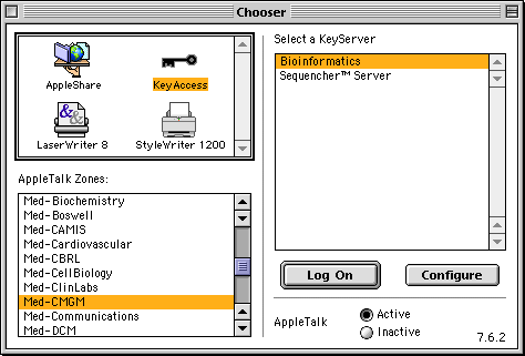 | Select "KeyAccess" from the top left portion of the Chooser window, "Med-CMGM" from the AppleTalk Zones field, and "Bioinformatics" from the list of keyservers to the right. |